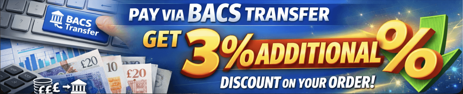 Pay via BACS transfer, get 3% additional discount on your order!